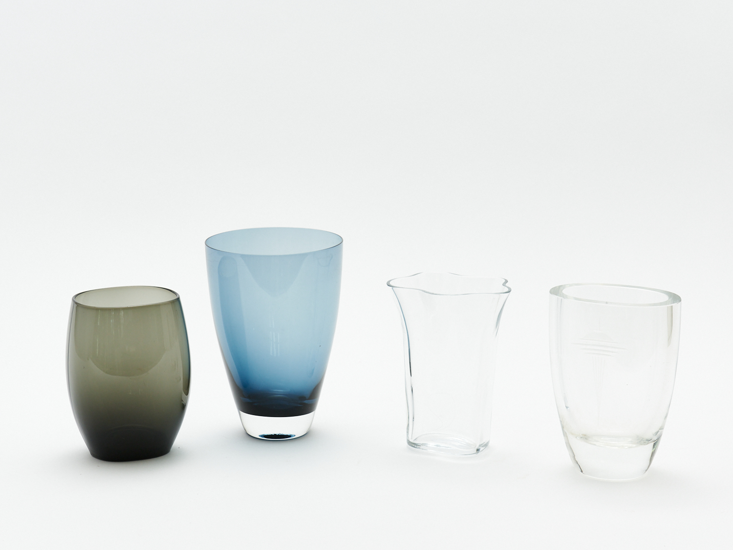 FOUR SMALL MID CENTURY STYLE GLASS VASES H.16 CM (TALLEST), LEONARD JOEL HOME DELIVERY SIZE: SMALL
