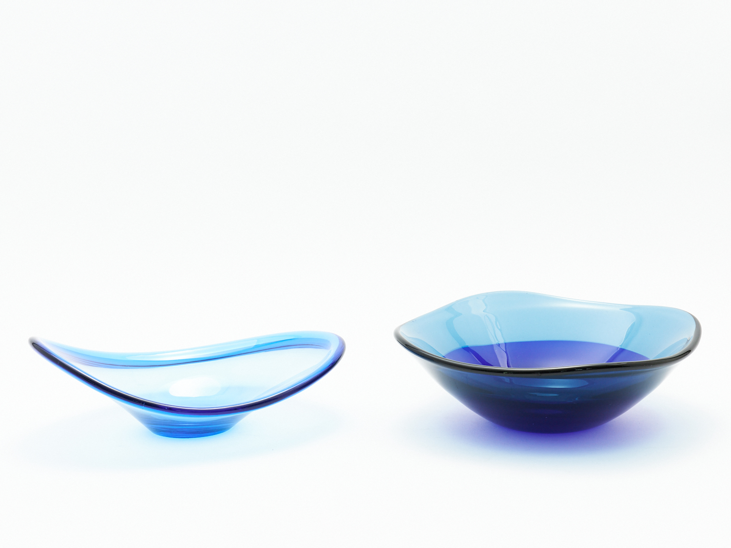 TWO MID CENTURY BLUE GLASS BOWLS DIA.26CM, LEONARD JOEL HOME DELIVERY SIZE: MEDIUM