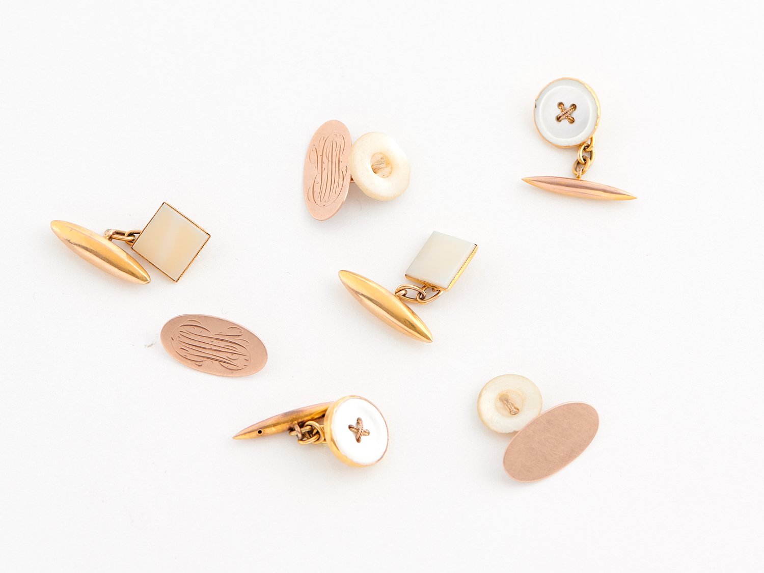 THREE PAIRS OF ANTIQUE CUFFLINKS, PLUS ONE EXTRA PLAQUE, IN 9CT GOLD, INCLUDING MOTHER OF PEARL SET, TOTAL WEIGHT 14.1GMS