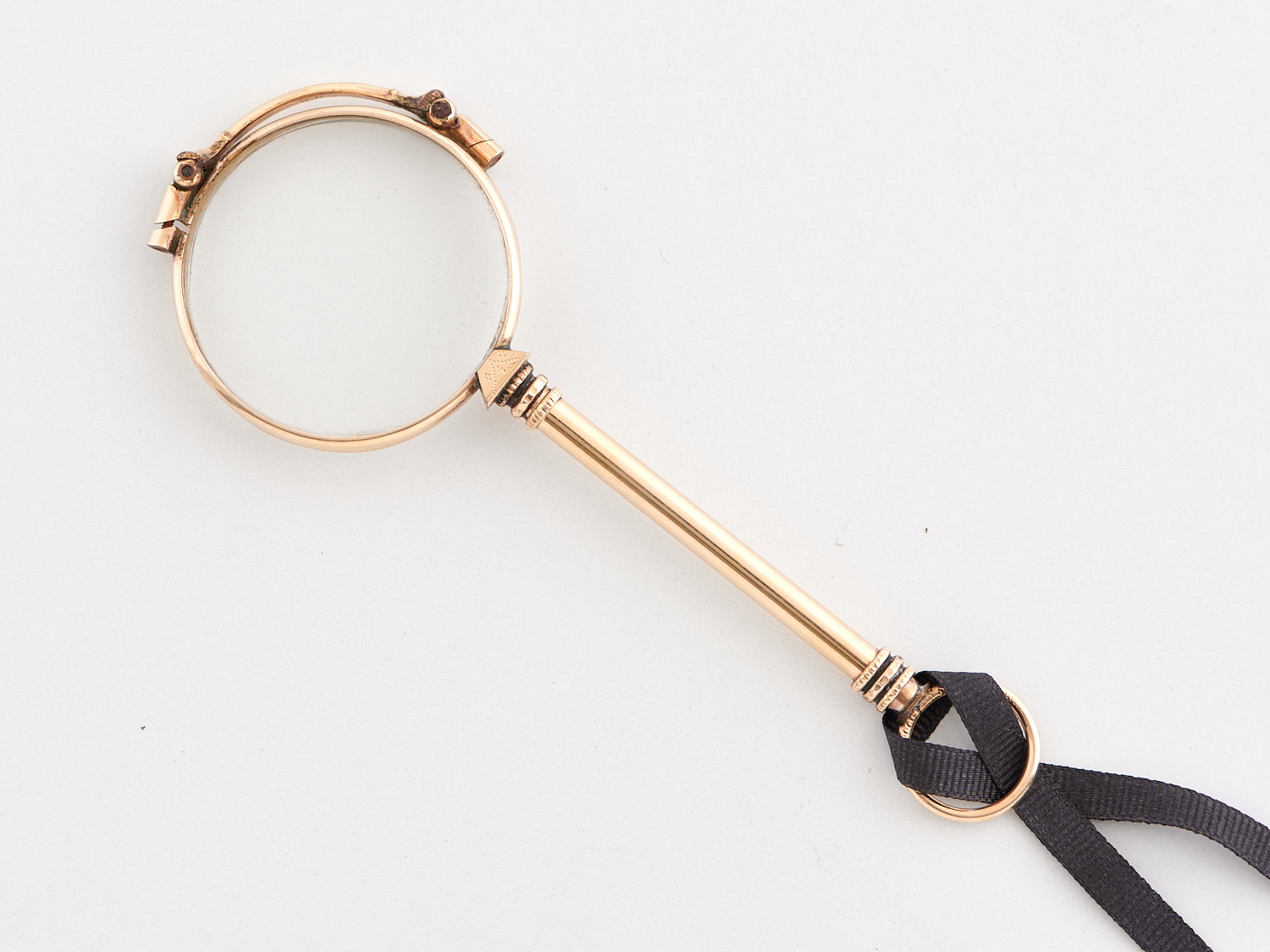 AN ANTIQUE LORGNETTE IN LOW CARAT GOLD, GLASS DIAMETER 38MM, LENGTH 112MM, TO A BLACK RIBBON