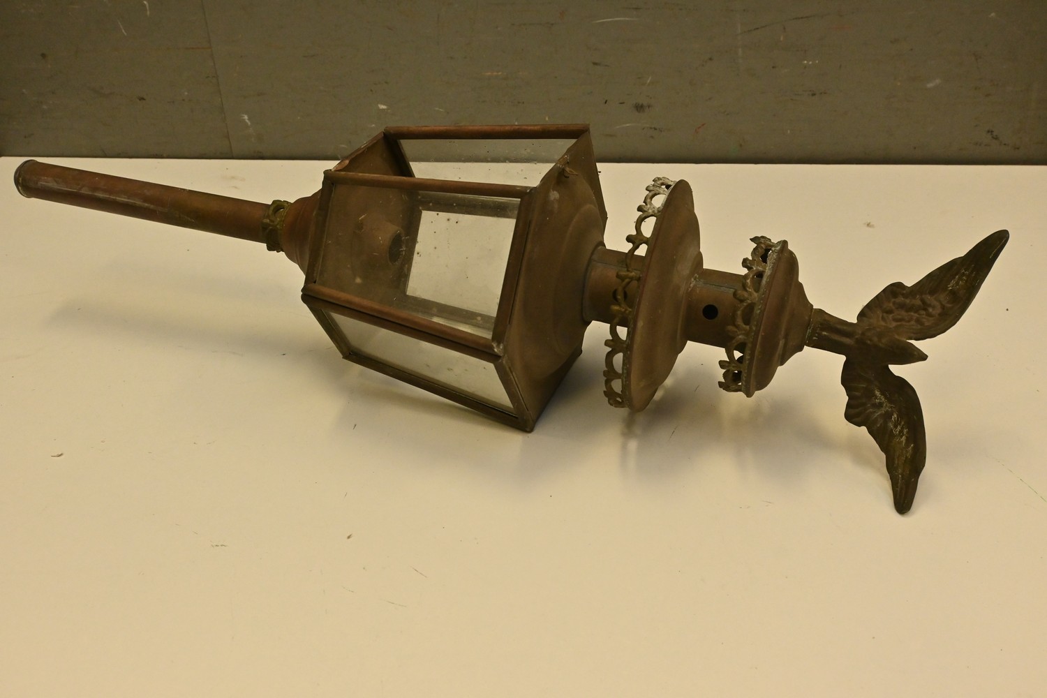 AN ANTIQUE BRASS CARRIAGE LANTERN (A/F) (78H CM) (LEONARD JOEL DELIVERY SIZE: LARGE)