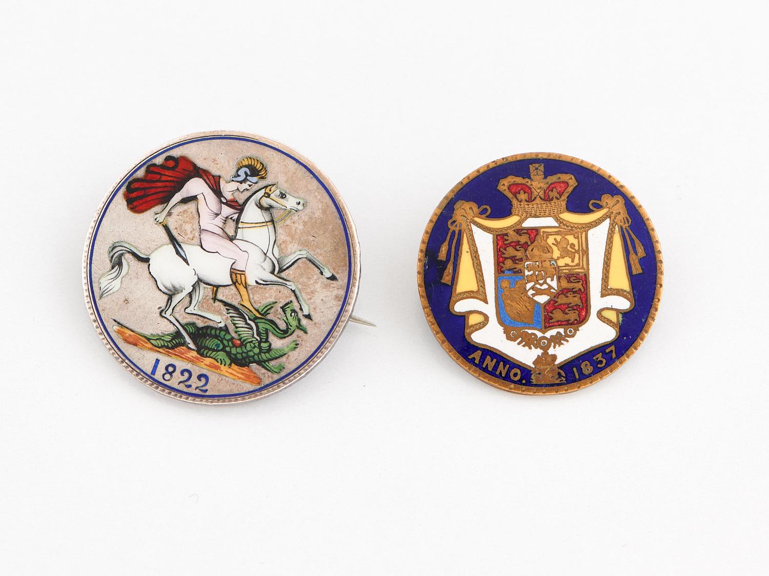 AN ENAMELLED 1822 GEORGE III STERLING SILVER COIN BROOCH, DIAMETER 37MM, TOGETHER WITH AN ENAMELLED ANNO 1837 BROOCH, DIAMETER 33MM