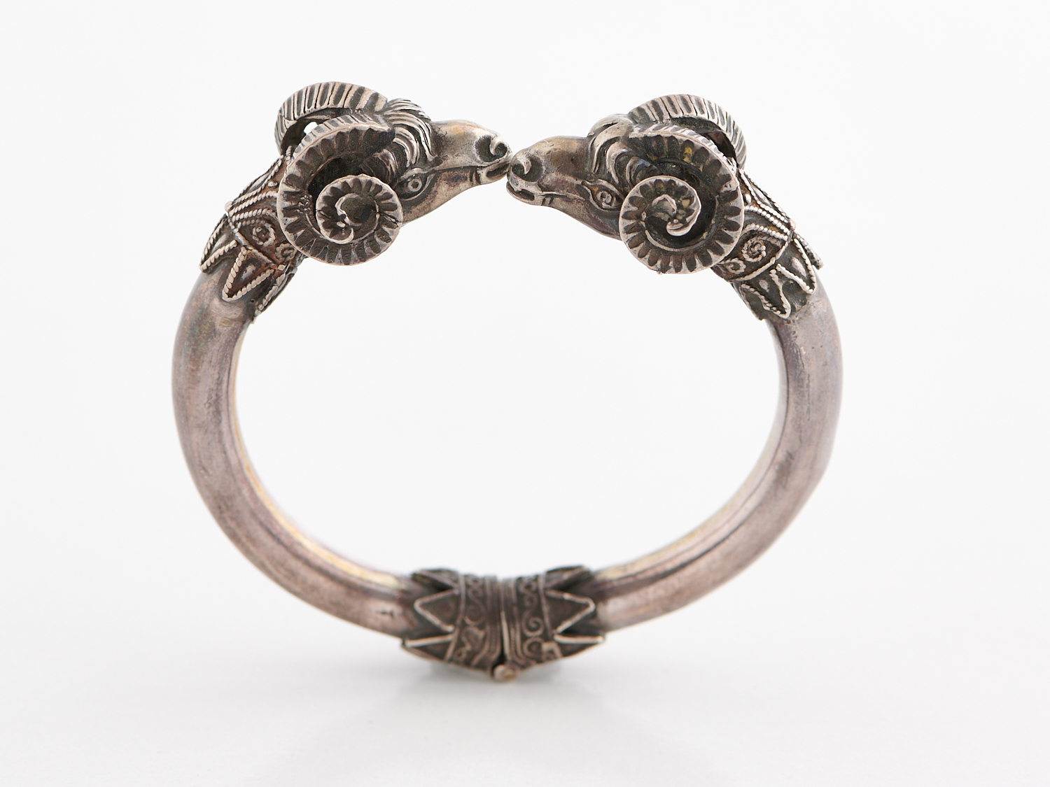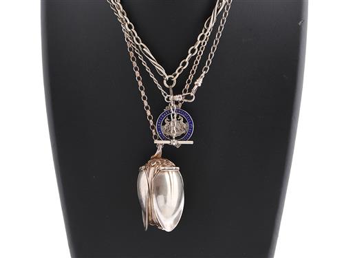 A VINTAGE PENDANT WATCH AND TWO CHAINS IN STERLING SILVER, TOGETHER WITH A RAM HEAD HINGED BANGLE IN SILVER, INNER DIAMETER 59MM