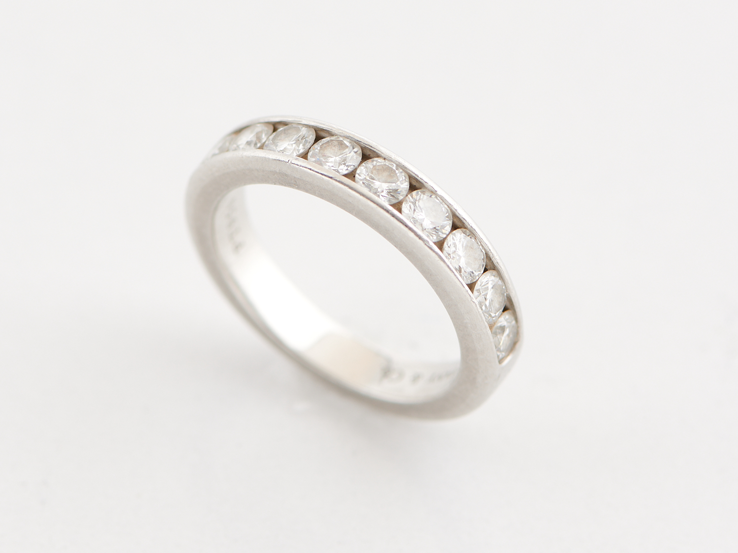 A DIAMOND RING IN PLATIUNM BY TIFFANY & CO, THE DIAMONDS TOTALLING APPROXIMATELY 0.72CTS, RING SIZE K, WEIGHT 7.1GMS, WITH POUCH