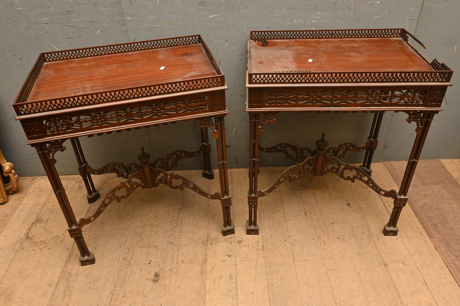 A PAIR OF MAHOGANY 'CHIPPENDALE GOTHICK'-STYLE SIDE TABLES (A/F) (69H X 59W X 40D CM) (LEONARD JOEL DELIVERY SIZE: LARGE)
