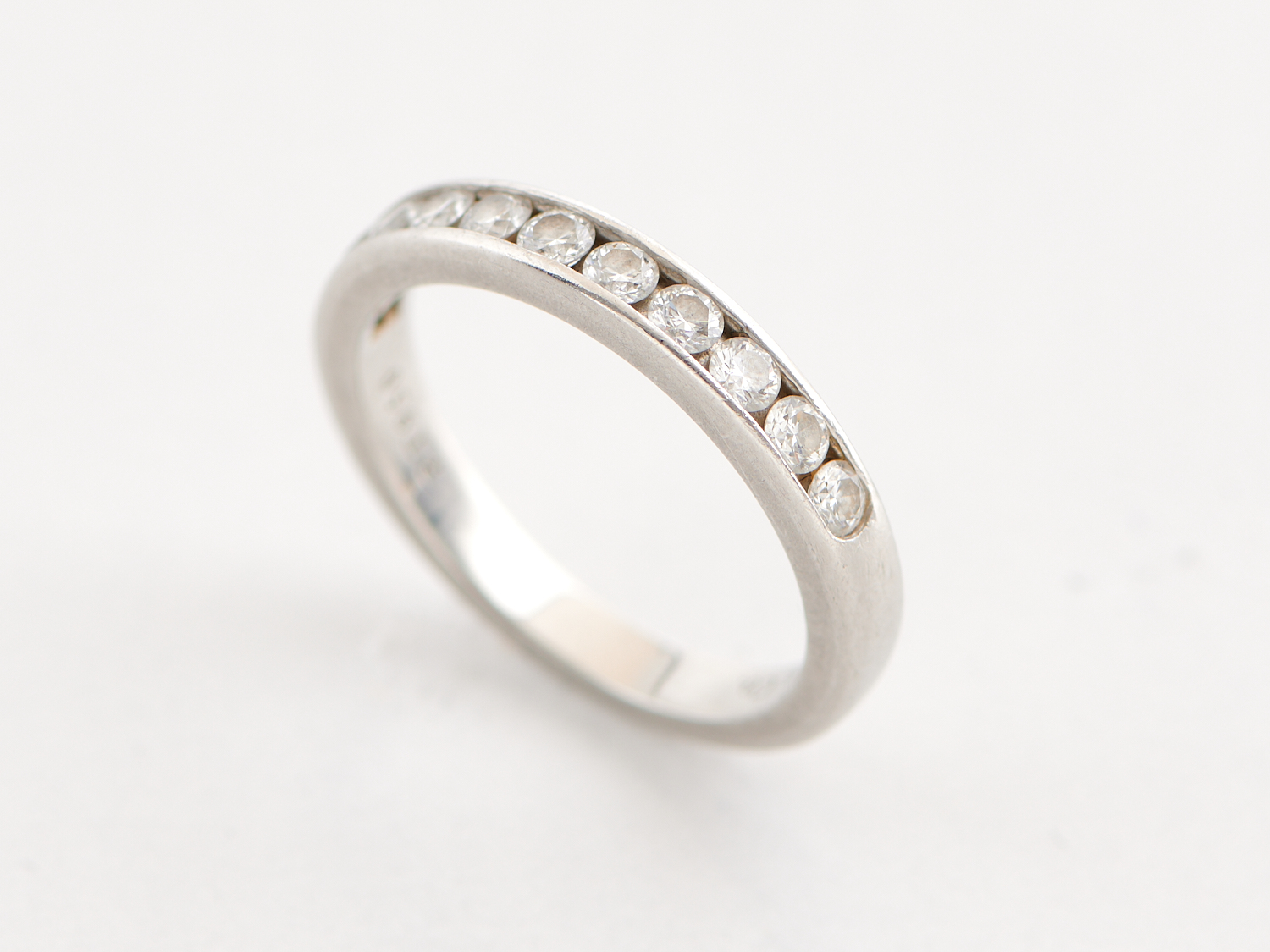 A DIAMOND SET RING IN PLATINUM BY TIFFANY & CO, THE DIAMONDS TOTALLING APPROXIMATELY 0.22 CARATS, RING SIZE K, WEIGHT 4.5GMS