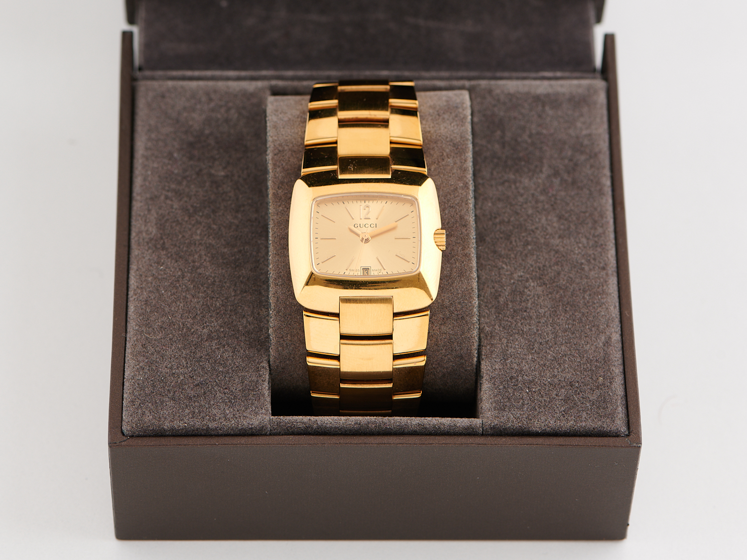 GUCCI, WRSTWATCH - Styled in gold tone metal, with date aperture at 6, accompanied by gucci box and papers.