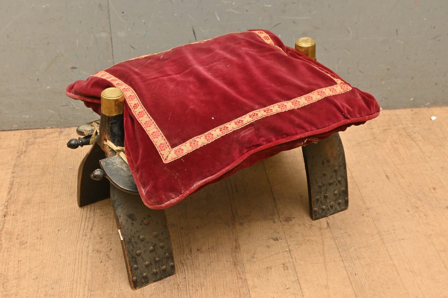 A CONTINENTAL WROUGHT IRON FOOT-STOOL WITH CUSHION (A/F) (40H X 60W X 52D CM) (LEONARD JOEL DELIVERY SIZE: MEDIUM)
