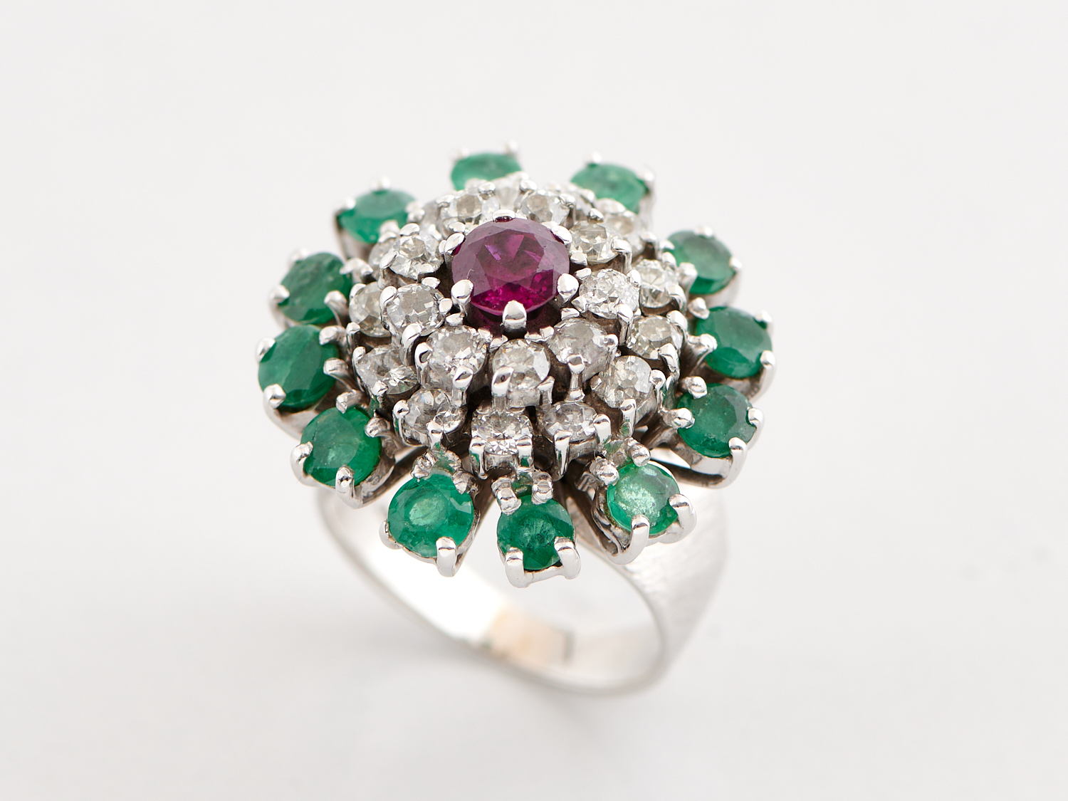 A VINTAGE RUBY, EMERALD AND DIAMOND RING IN 18CT WHITE GOLD AND PLATINUM, RING SIZE J, WEIGHT 12.2GMS