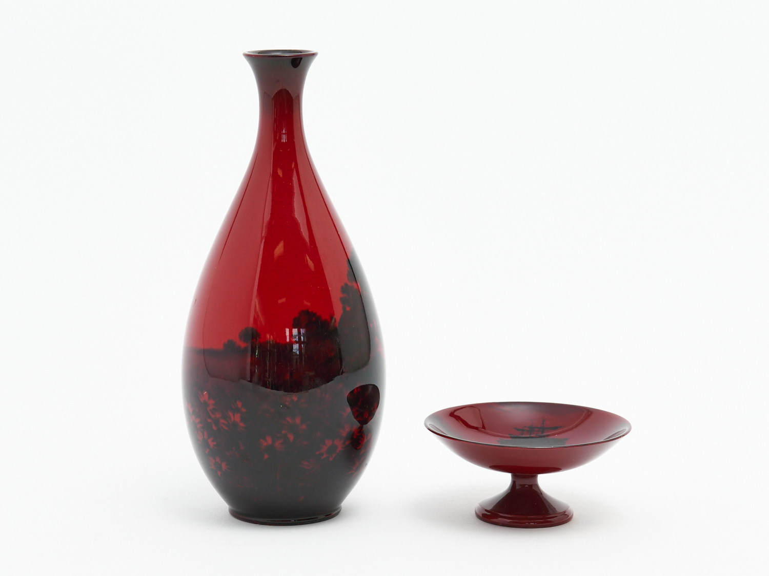 A ROYAL DOULTON FLAMBE VASE WITH COTTAGE SCENE, H.22CM (A/F) AND TRINKET DISH WITH TALL SHIP DECORATION, DIA.9CM, LEONARD JOEL HOME DELIVERY SIZE: SMALL