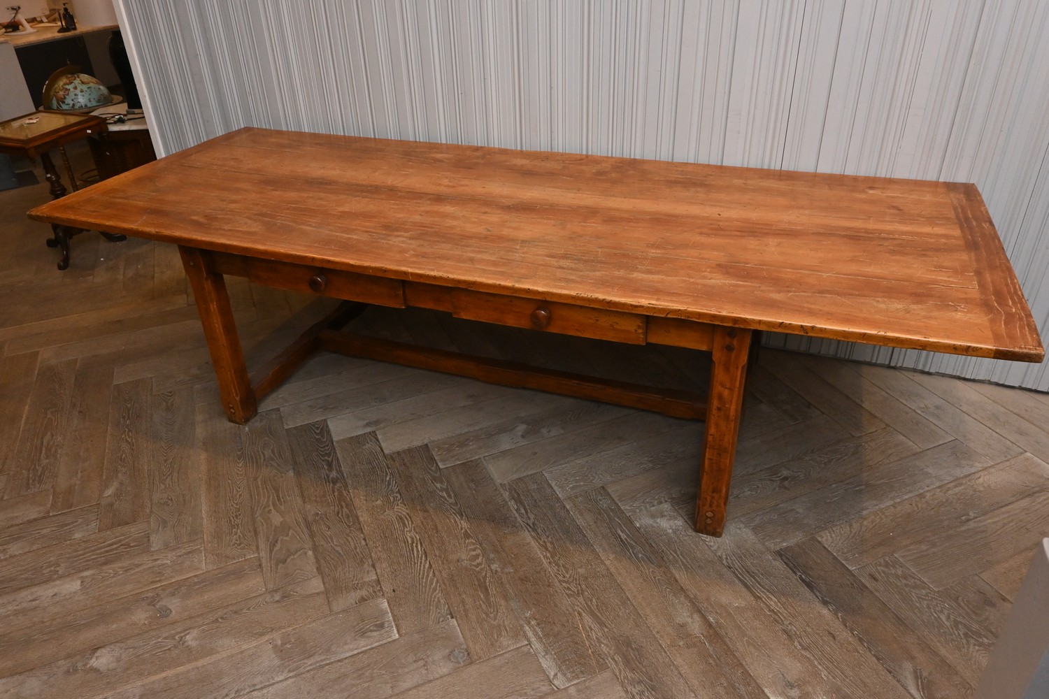 A SUBSTANTIAL CHERRY WOOD FARMHOUSE-TYPE DINING TABLE ON TRESTLE SUPPORTS, WITH FRIEZE DRAWERS TO ONE SIDE (76H X 300W X 116D CM) (THIS HEAVY ITEM MUST BE REMOVED BY CLIENTS OR CARRIERS AT THE CUSTOMERS EXPENSE. LEONARD JOEL STAFF CANNOT ASSIST CARRYING THIS ITEM)