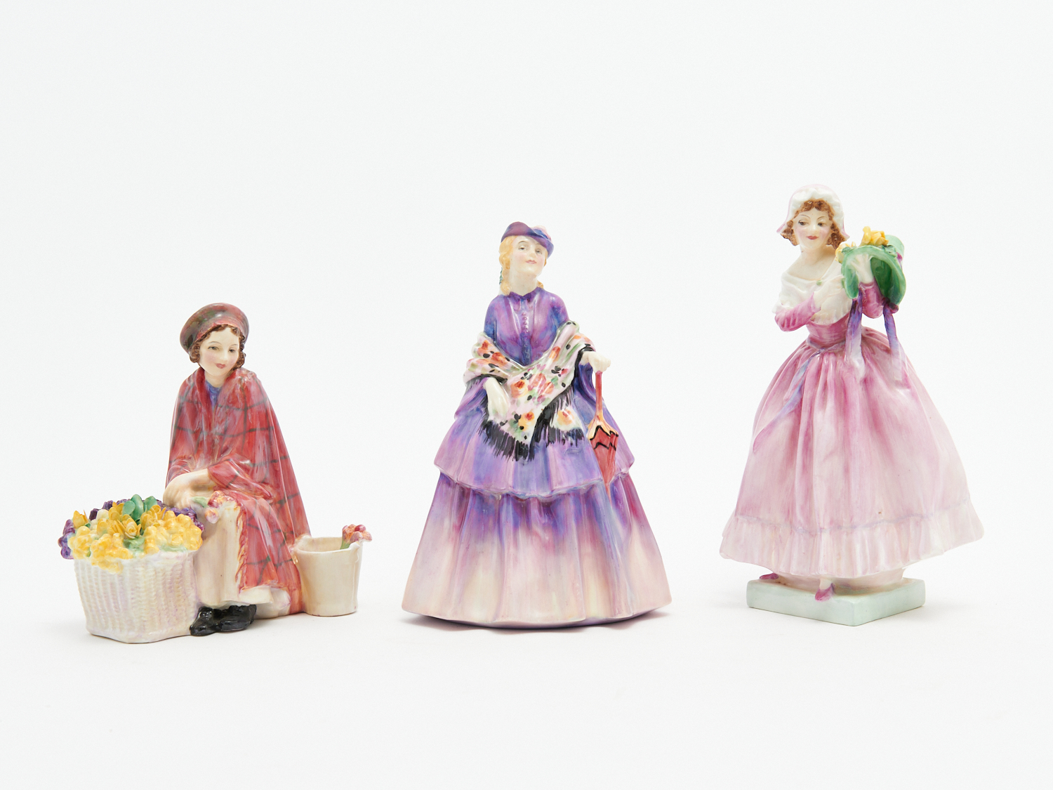 THREE ROYAL DOULTON FIGURINES MODELLED BY LESLIE HARRADINE INCLUDING "THE NEW BONNET" HN11728 1935-49 H.19CM, "ANTHEA" HN1527 1933, H.17CM AND "BONNIE LASSIE" HN1626 1936, H.14CM, LEONARD JOEL HOME DELIVERY SIZE: SMALL