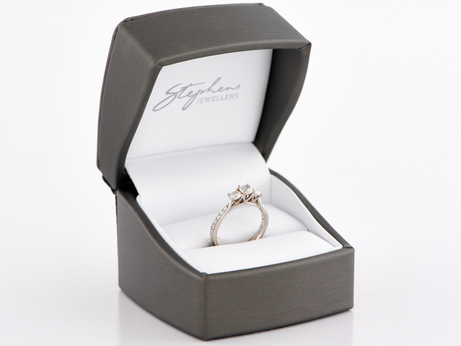 A THREE STONE DIAMOND RING IN 18CT WHITE GOLD, THE CENTRAL DIAMOND WEIGHING 0.41CTS (ACCOMPANIED BY GIA 6245229400 STATING COLOUR G, CLARITY SI2, THE SURROUNDING DIAMONDS TOTALLING 0.59CTS, RING SIZE M