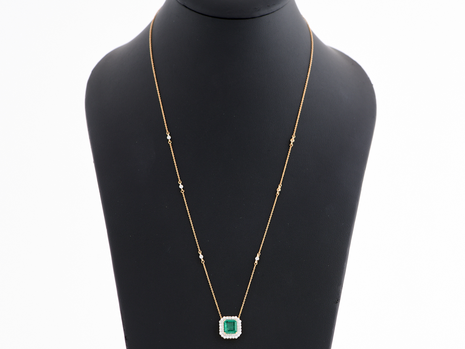 AN EMERALD AND DIAMOND PENDANT IN 18CT GOLD, THE EMERALD WEIGHING APPROXIMATELY 1.68CT, TOTAL DIAMOND ESTIMATED 0.47CTS, TOTAL LENGTH 526MM