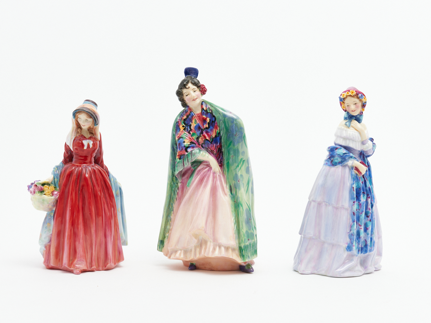 THREE ROYAL DOULTON FIGURINES MODELLED BY LESLIE HARRADINE INCLUDING "ROSEMARY" HN2091 1952-79 H.19CM, "LIZANA" HN1756 1936-49, H.21CM AND "CHRISTINE" HN1839 1938-40, H.21CM (A/F), LEONARD JOEL HOME DELIVERY SIZE: SMALL
