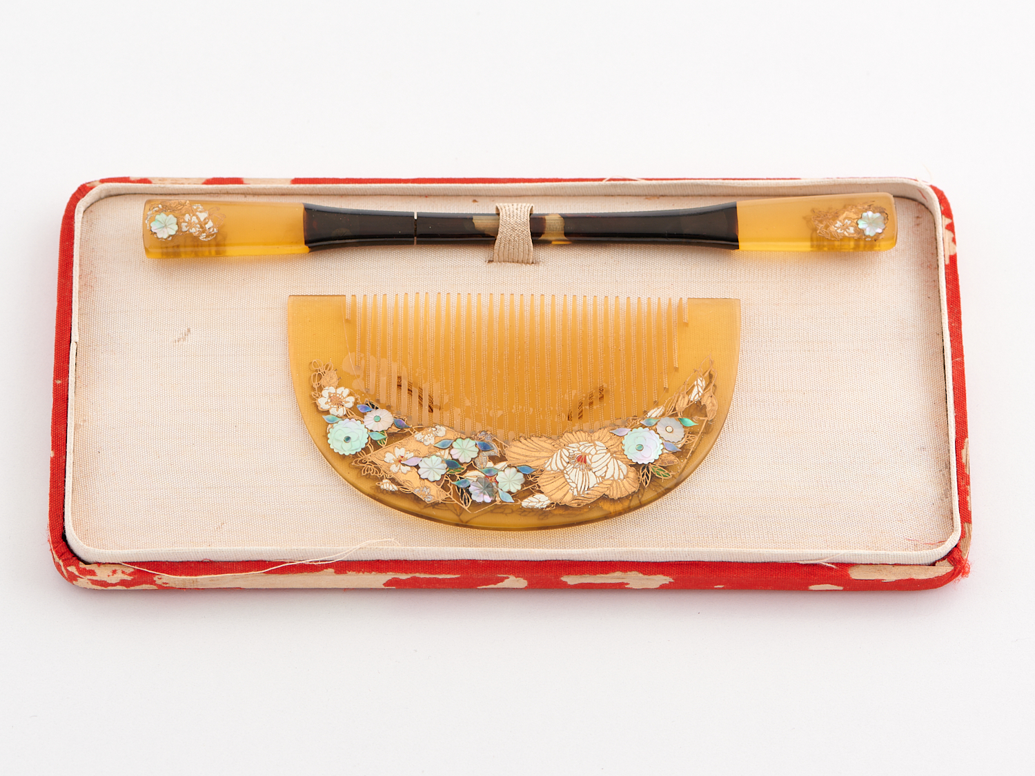 A VINTAGE JAPANESE COMB AND HAIR PIN WITH GOLD AND MOTHER OF PEARL INLAY, IN ORIGINAL BOX
