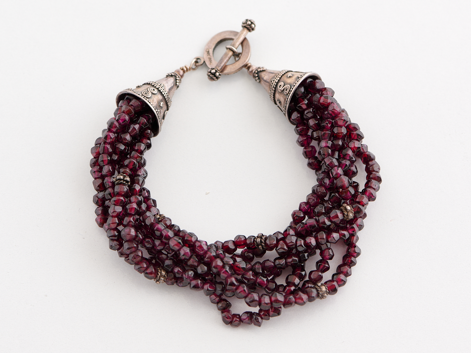 A VINTAGE FACETED GARNET BEAD BRACELET TO SILVER CAPS AND TOGGLE CLASP, LENGTH 210MM