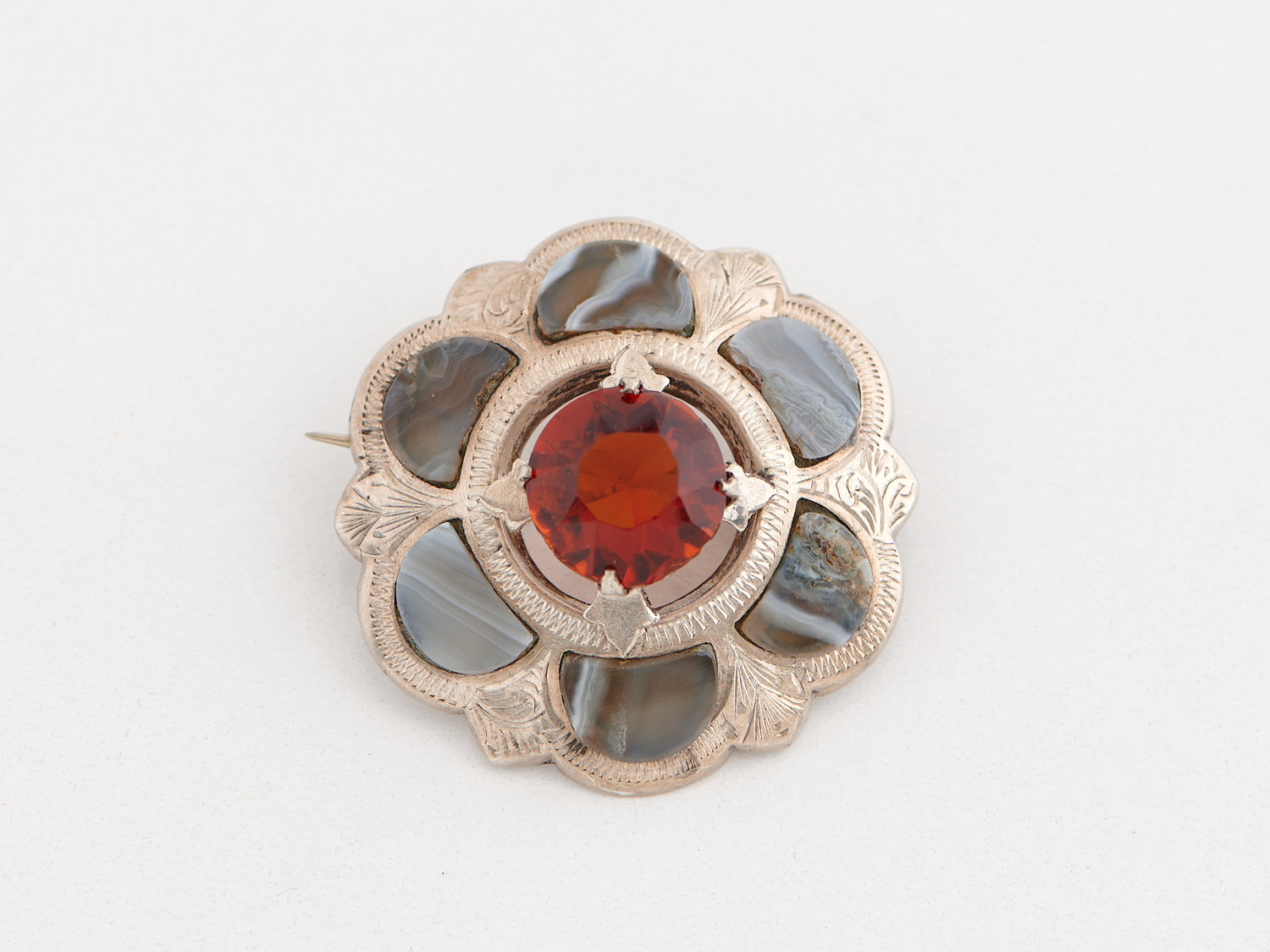AN ANTIQUE SCOTTISH SPECIMEN AGATE BROOCH IN SILVER, DIAMETER 34MM
