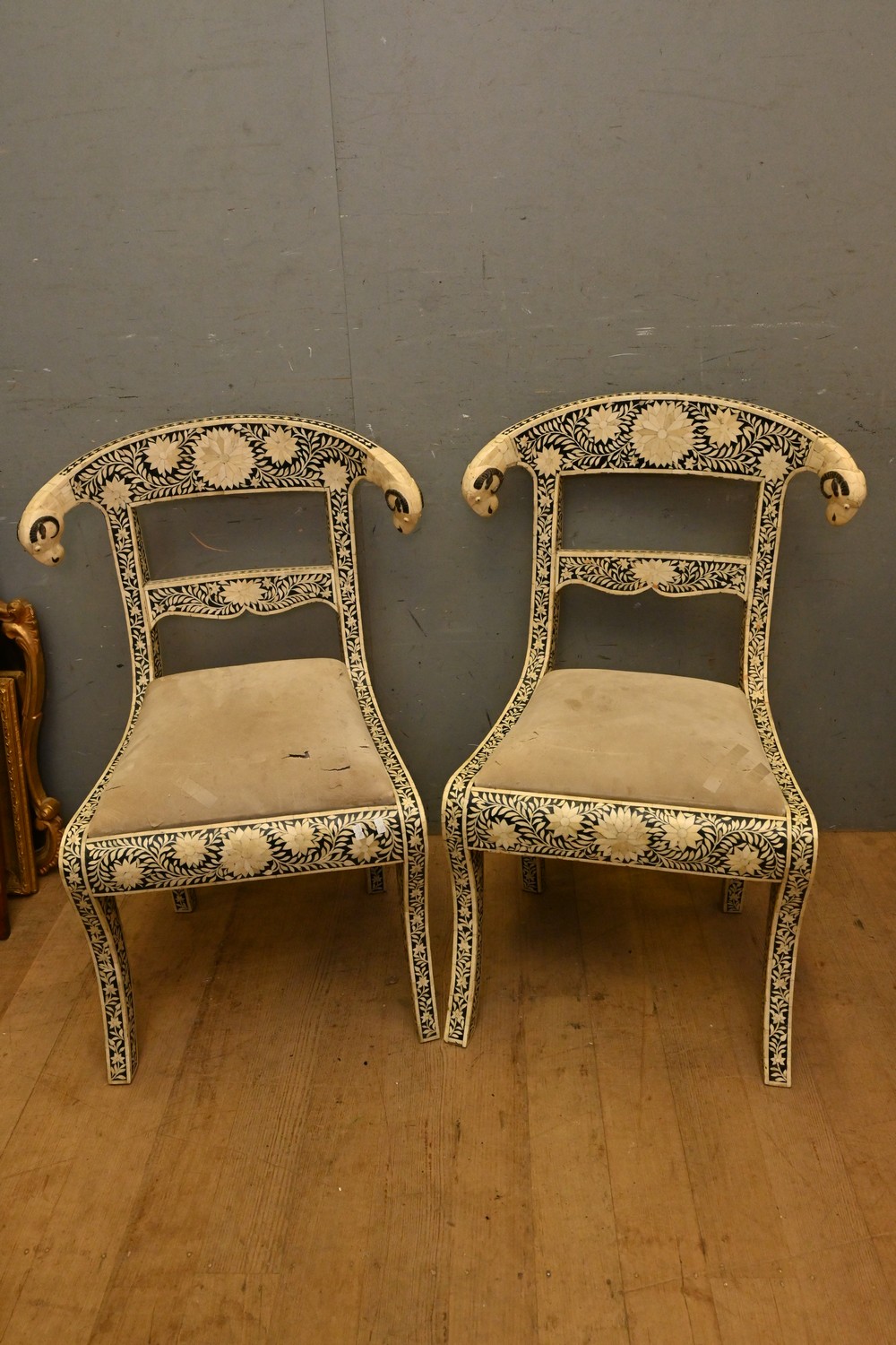 A PAIR OF ANTIQUE-STYLE INDIAN BONE AND HORN-INLAID SIDE CHAIRS, WITH RAM'S HEAD TERMINALS (A/F) (90H X 63W X 57D CM) (LEONARD JOEL DELIVERY SIZE: LARGE)