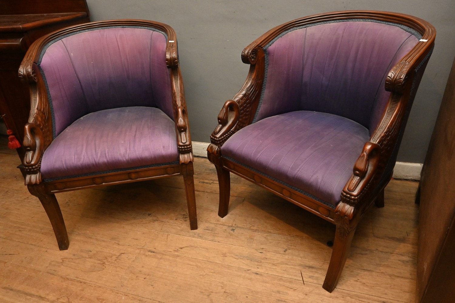 A PAIR OF FRENCH EMPIRE-STYLE MAHOGANY BOW-BACK BERGERES (A/F) (86H X 66W X 72D CM) (LEONARD JOEL DELIVERY SIZE: X-LARGE)