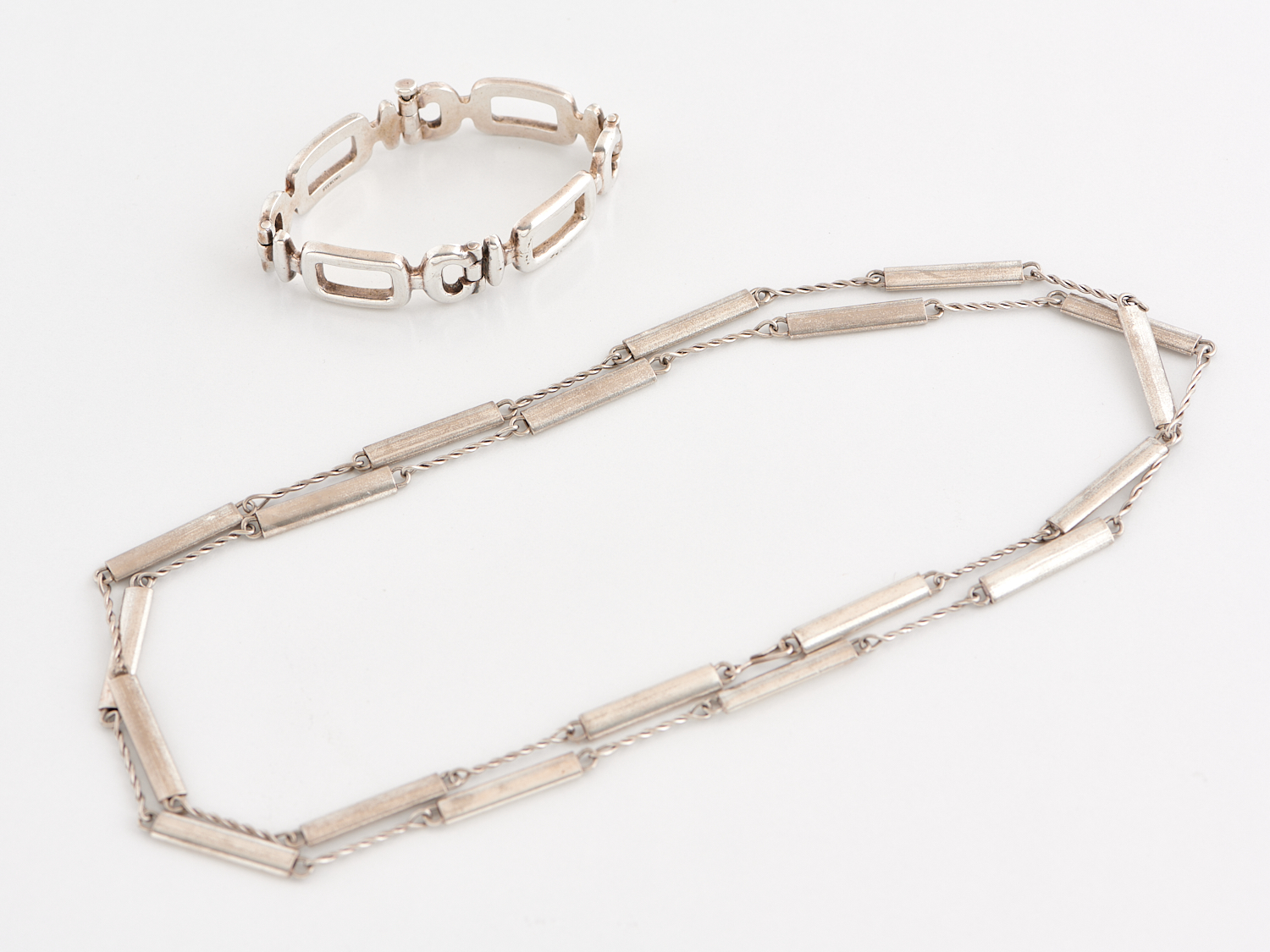 A VINTAGE SILVER BRACELET, LENGTH 180MM, AND LONG CHAIN, LENGTH 1170MM