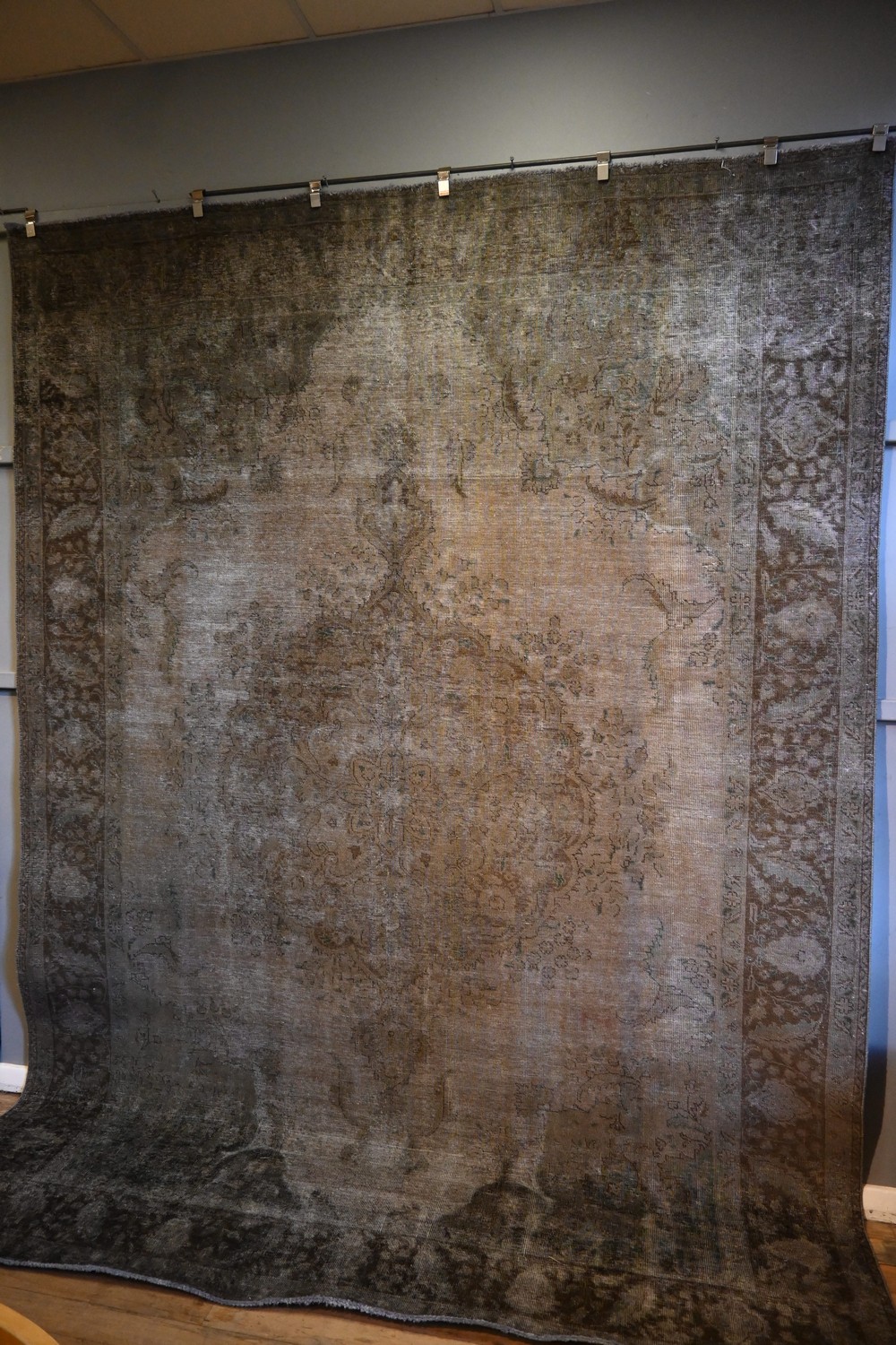 AN ATTRACTIVE VINTAGE OVER-DYED PERSIAN TABRIZ CARPET, VINTAGE PILE. A UNIQUE MODERN CARPET WITH A CENTRAL MEDALLION DESIGN TABRIZ CARPET. THE PILE SHORN AND OVER-DYED IN CHARCOAL, BROWN, AND A HINT OF TEAL TONES. SIZE: 386 X 288 CM ORIGIN: PERSIA - RRP: $7,500 DOCUMENTATION OF AUTHENTICITY INCLUDED.