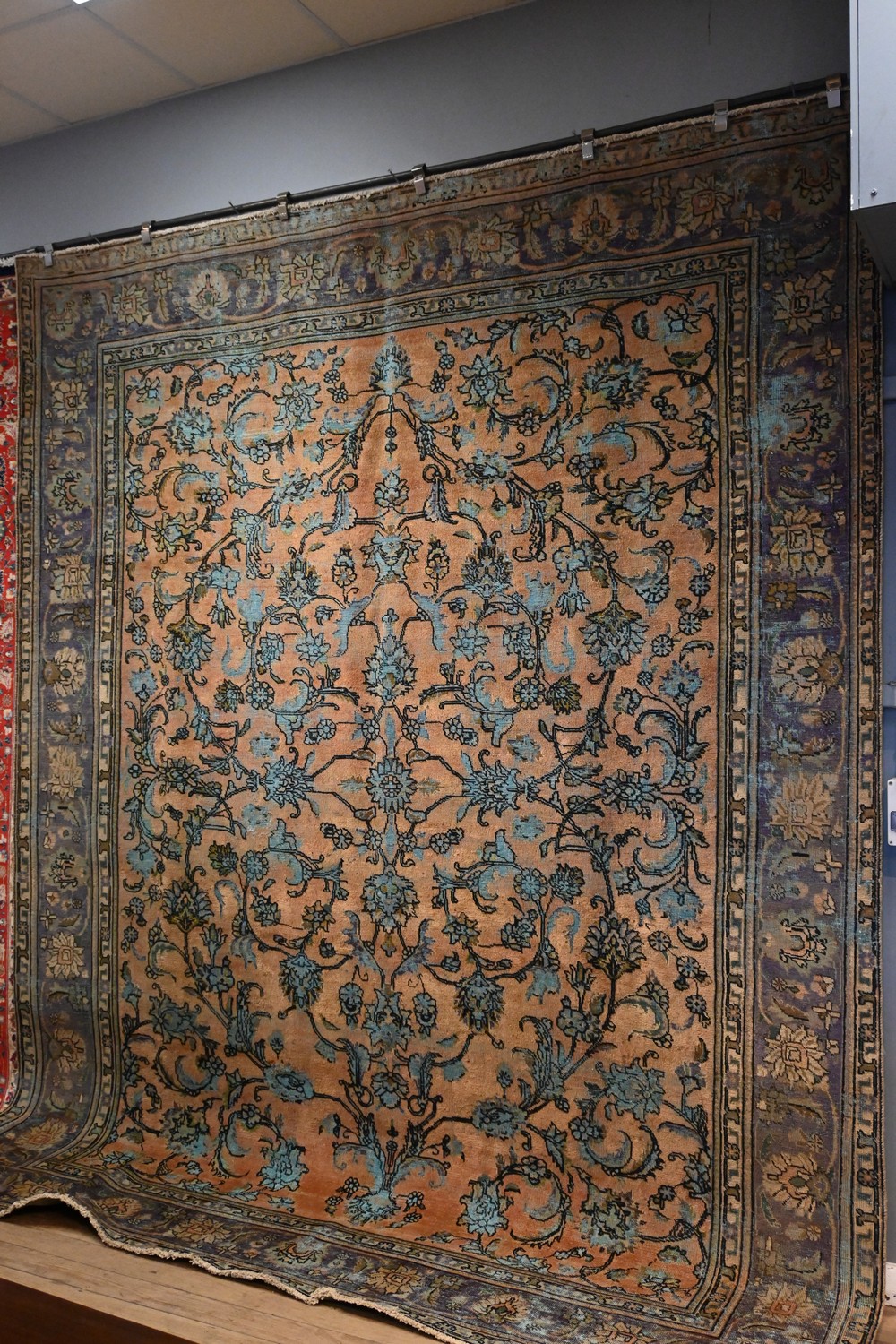 A FASHIONABLE VINTAGE OVER-DYED PERSIAN TABRIZ CARPET. A VINTAGE CARPET WITH AN ALL-OVER DESIGN OF PALMETTES AND FLORAL SPRAYS. WITH THE PILE SHORN AND OVER-DYED IN LIGHT BLUE, TERRACOTTA AND DARK MAUVE TONES. SIZE: 373 X 299 CM ORIGIN: PERSIA - RRP: $7,900 DOCUMENTATION OF AUTHENTICITY INCLUDED.