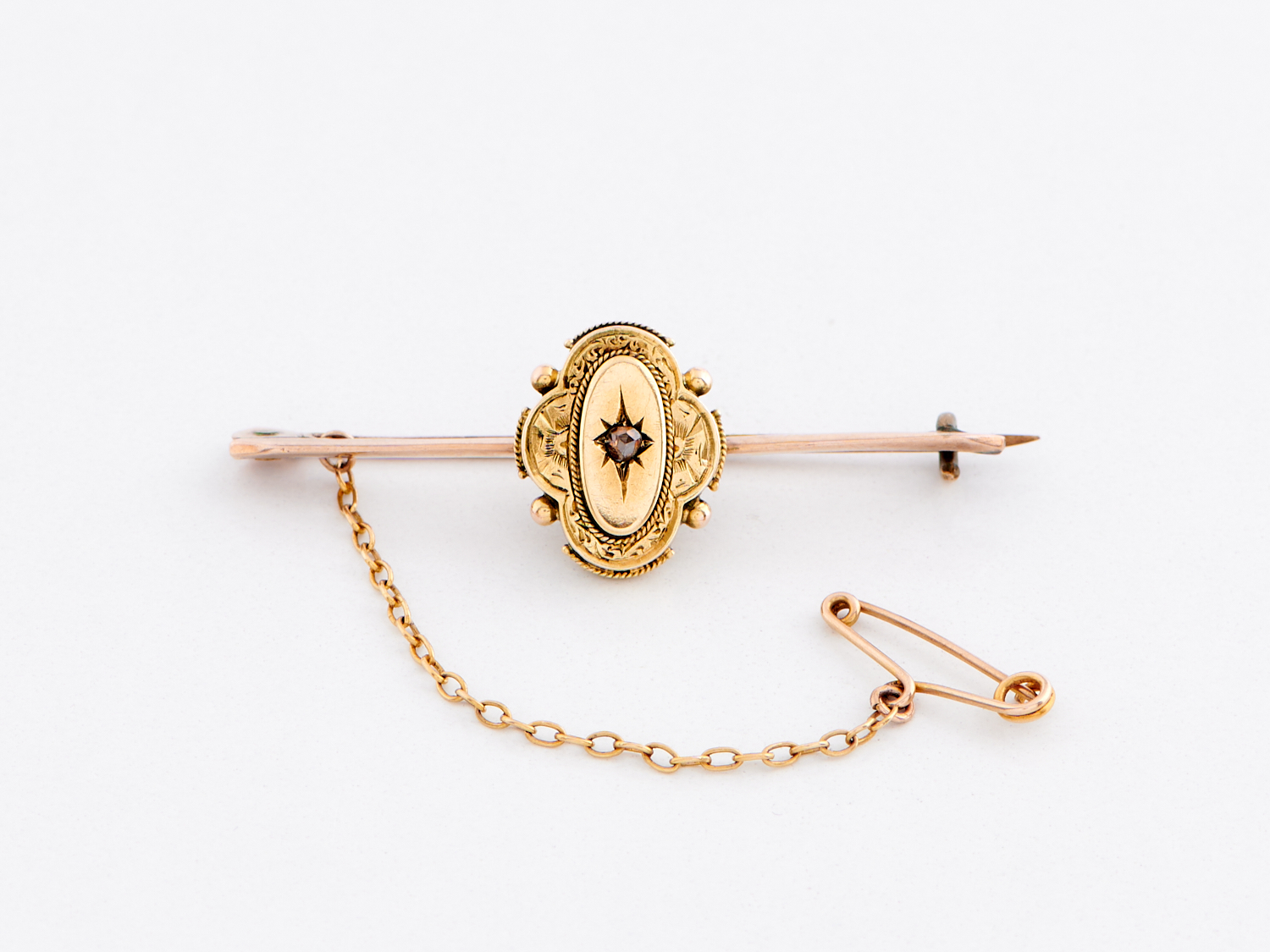AN ANTIQUE DIAMOND SET BROOCH IN 9CT GOLD BY FISCHER, STAMPED, LENGTH 46MM, WEIGHT 4.2GMS