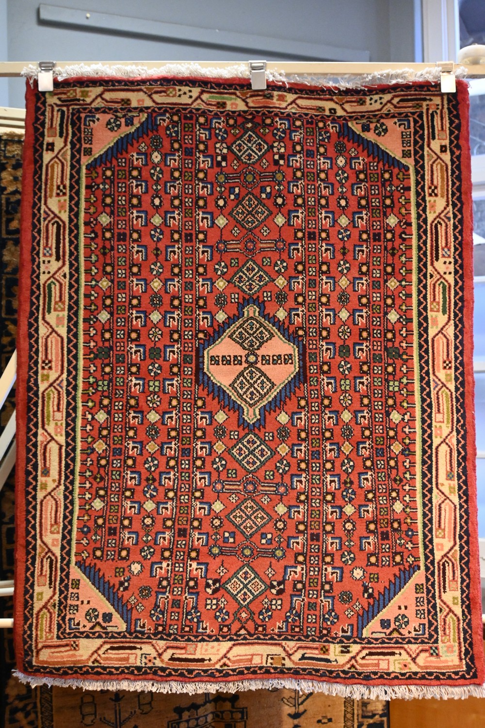 A FINE PERSIAN ENJELAS RUG 100% WOOL & NATURAL DYES. HAND-KNOTTED VILLAGE WEAVE WITH TRIBAL DESIGN OF A DIAMOND CENTRAL MEDALLION IN A FIELD OF ALL OVER TRIBAL MOTIFS ON A RED TONE FIELD. BORDER OF GEOMETRIC DESIGNS. SIZE: 132 X 101 CM