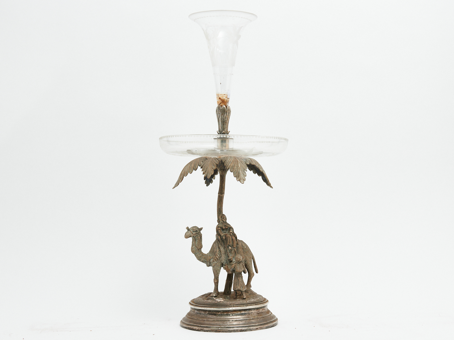 A SILVER PLATED CENTREPIECE WITH ETCHED GLASS AND FIGURAL EASTERN SCENE TO BASE, H.53CM, LEONARD JOEL LOCAL DELIVERY: MEDIUM
