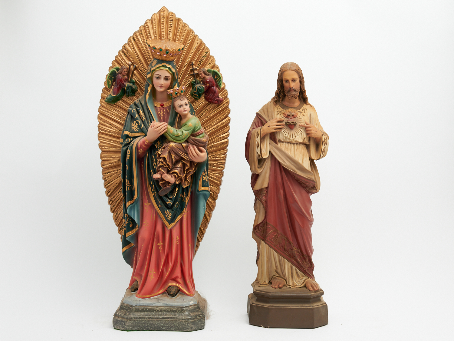 A PLASTER FIGURE OF MARY AND CHILD TOGETHER WITH JESUS FIGURE, H.76CM (TALLEST), LEONARD JOEL LOCAL DELIVERY: MEDIUM