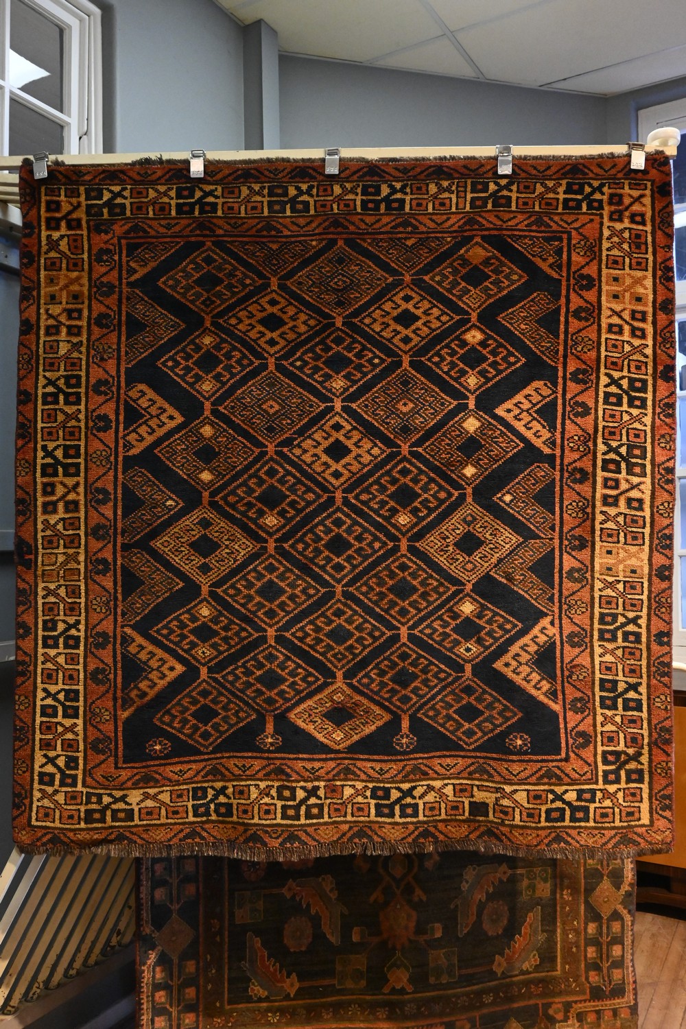 A CIRCA 1970'S TRIBAL PERSIAN LURI RUG, 100% WOOL & NATURAL DYES, VINTAGE PILE. UNUSUAL SQUARE SIZE. TRIBAL WEAVE & DESIGN OF ALL OVER DIAMOND SHAPED ANCHORED MEDALLIONS ON A NAVY FIELD. BORDER OF TRIBAL PATTERNS AND MINIATURE ROSETTES. SOME RESTORATION. SIZE: 165 X 160 CM ORIGIN: IRAN - RRP: $1,900 DOCUMENTATION OF AUTHENTICITY INCLUDED.