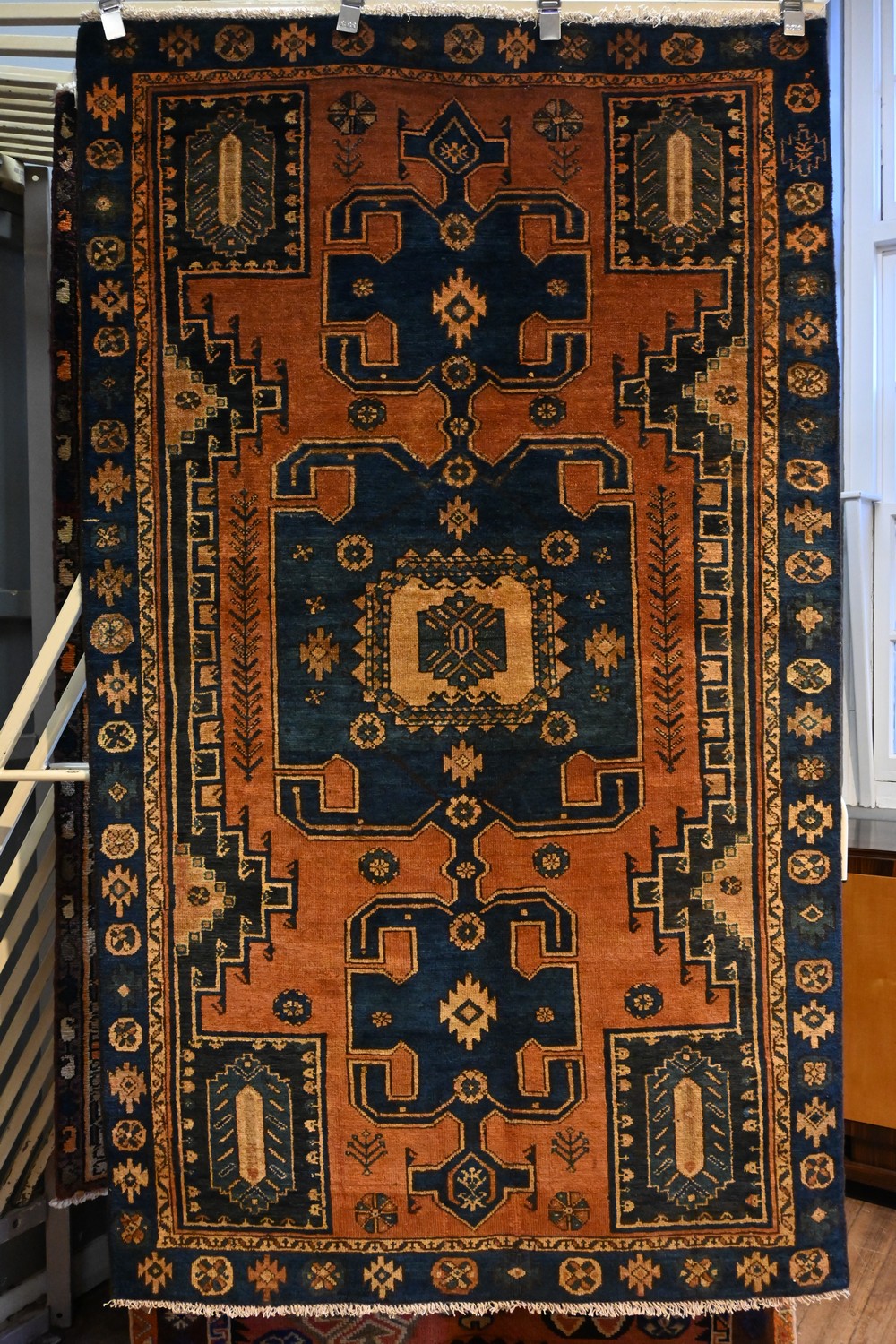A PERSIAN CIRCA 1960'S MESHKIN RUG. 100% WOOL. VINTAGE PILE, HAND-KNOTTED, ORGANIC DYES. WITH A DESIGN OF TRIPLE BOLD ANGULAR MEDALLIONS IN ROYAL BLUE ON A SOFT RED FIELD OF TRIBAL GEOMETRIC ROSETTES, TREE OF LIFE DESIGNS AND CORNER GEOMETRIC CORNER MEDALLIONS. SOME RESTORATION. SIZE: 210 X 123 CM ORIGIN: IRAN - RRP: $2,100 DOCUMENTATION OF AUTHENTICITY INCLUDED.