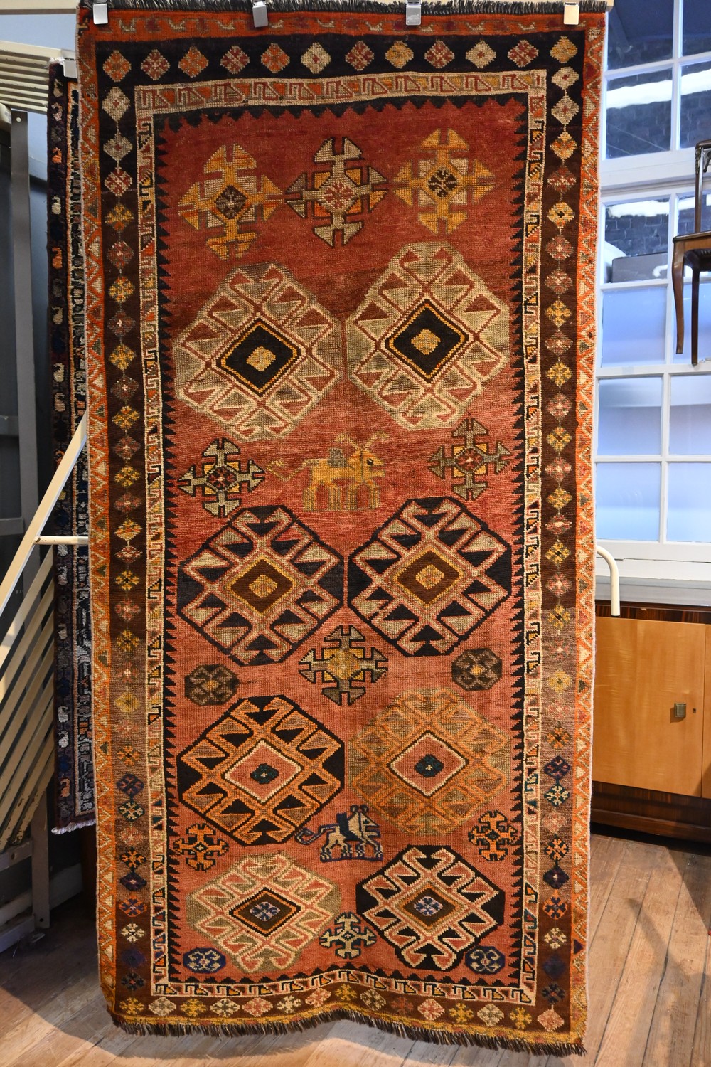 A VINTAGE TRIBAL PERSIAN KOHI RUG. 100% WOOL, NATURAL DYES, VINTAGE PILE. HAND-KNOTTED TRIBAL KOHI WEAVE WITH AN ALL-OVER DESIGN OF LARGE ROSETTES ON A SOFT RED FIELD OF AMULETS AND ANIMAL MOTIFS. BORDER OF GEOMETRIC AND MINI ROSETTES. SOME NATURAL ABRASH.SIZE: 240 X 120 CM ORIGIN: PERSIA - RRP: $2,100 DOCUMENTATION OF AUTHENTICITY INCLUDED