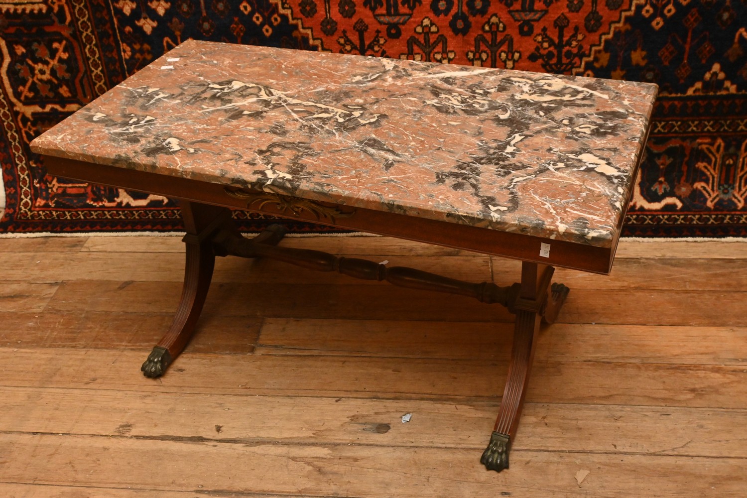 A MARBLE-TOPPED MAHOGANY LOW TABLE IN REGENCY MANNER (A/F) ( 47H X 93W X 47D CM)