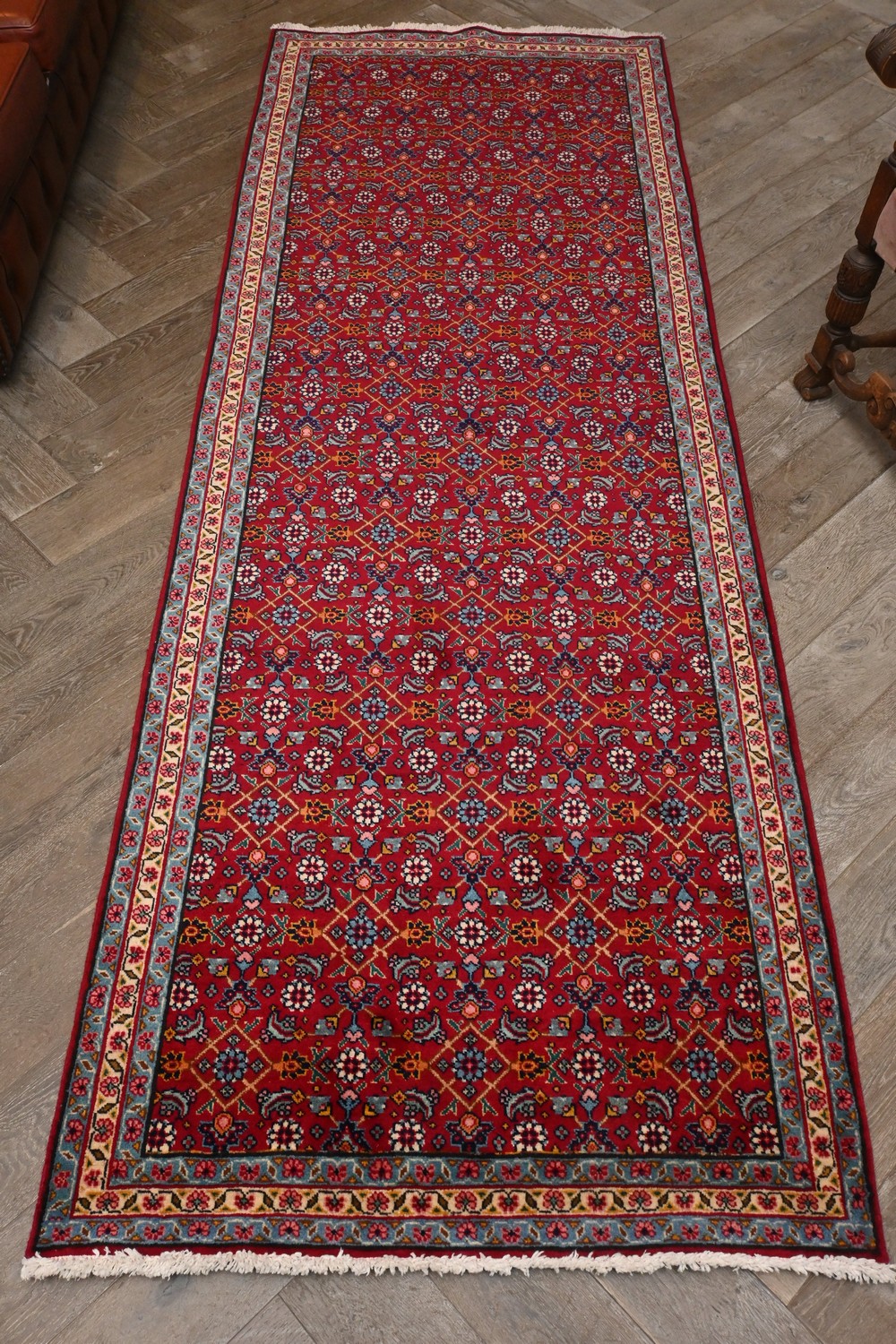 A SOLID TABRIZ WIDE RUNNER. 100% FINE WOOL DENSE PILE. HARD-WEARING. WITH A DESIGN OF ALL-OVER FLORAL HERATI MAHI PATTERNS ON A RED FIELD. BORDER OF FLORAL MOTIFS AND ROSETTES. SIZE: 110 X 312 CM ORIGIN: PERSIA - RRP: $2,900 DOCUMENTATION OF AUTHENTICITY INCLUDED.
