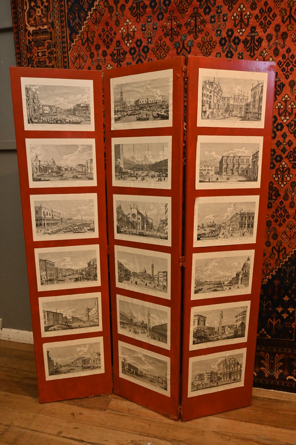 A PAINTED WOOD FOUR-LEAF SCREEN DECORATED WITH APPLIED FACSIMILE 18th CENTURY ENGRAVINGS (A/F) ( EACH PANEL 189H X 45W CM)