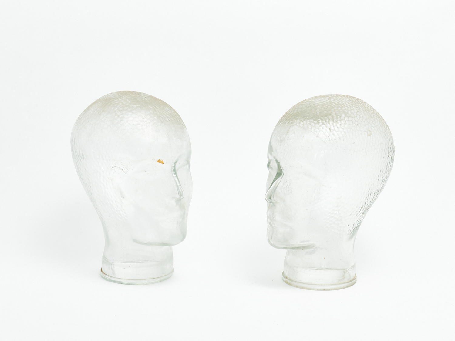 TWO PRESSED GLASS HEAD FORM HAT STANDS, H.27CM, LEONARD JOEL LOCAL DELIVERY: MEDIUM