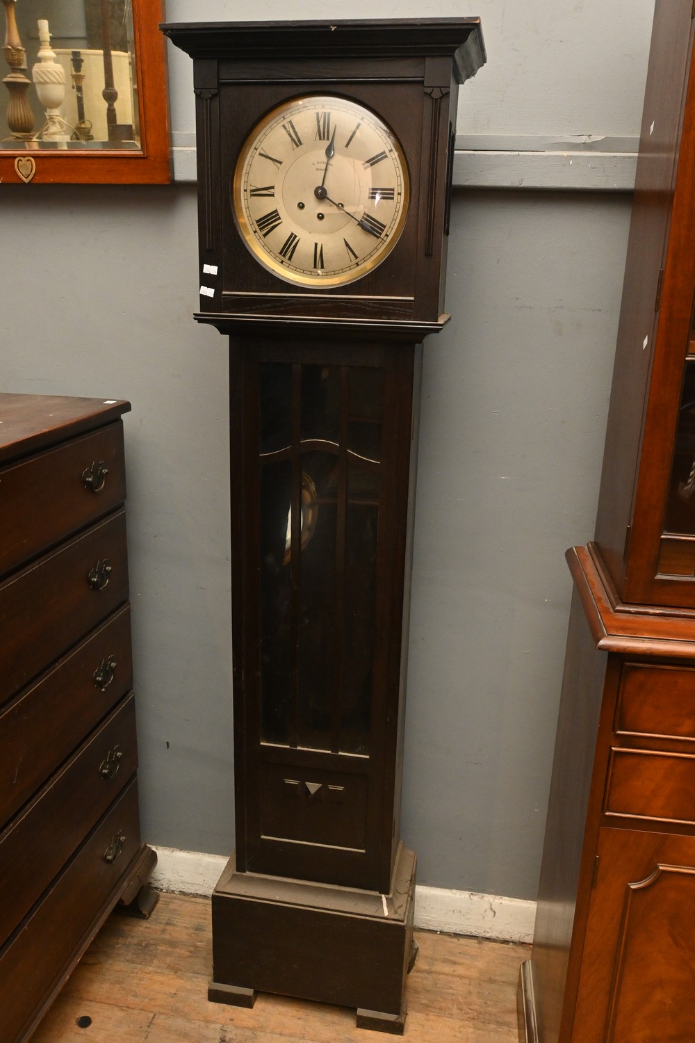 A 1930s OAK-CASED LONG-CASE CLOCK, THE DIAL SIGNED A. SAUNDERS, SYDNEY (A/F) (173H X 44W X 25D CM) (LEONARD JOEL DELIVERY SIZE: X-LARGE)