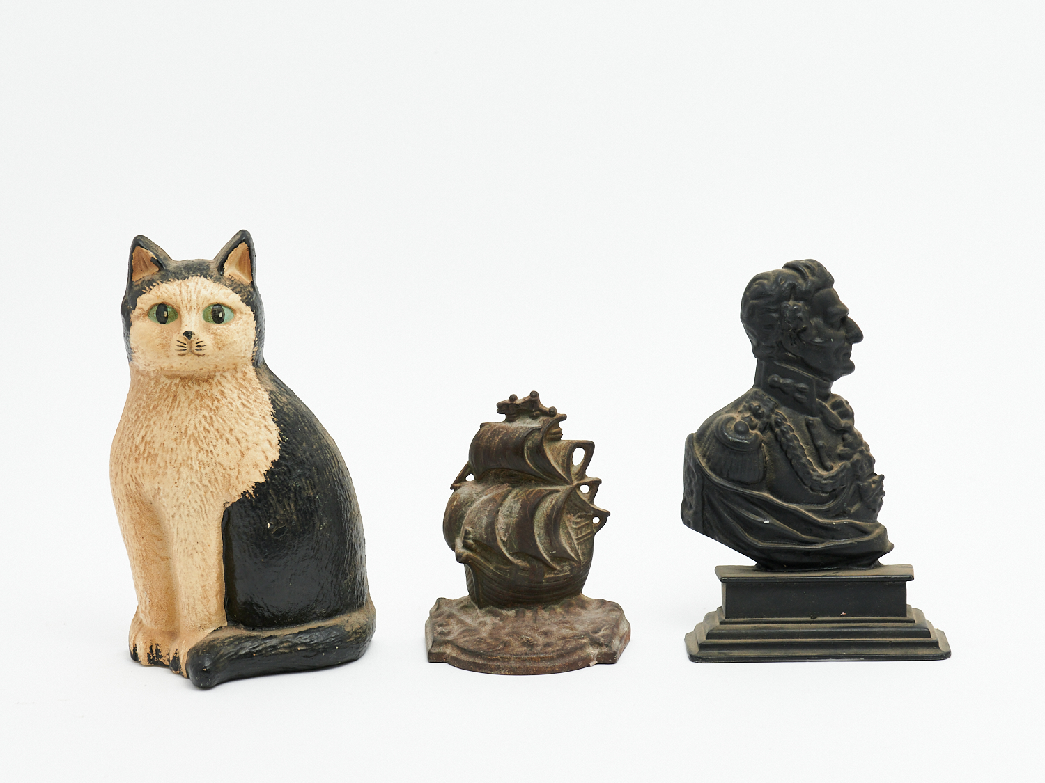 A CAST IRON CAT FORM DOOR STOP TOGETHER WITH TWO OTHERS H.25CM (TALLEST), LEONARD JOEL LOCAL DELIVERY: SMALL