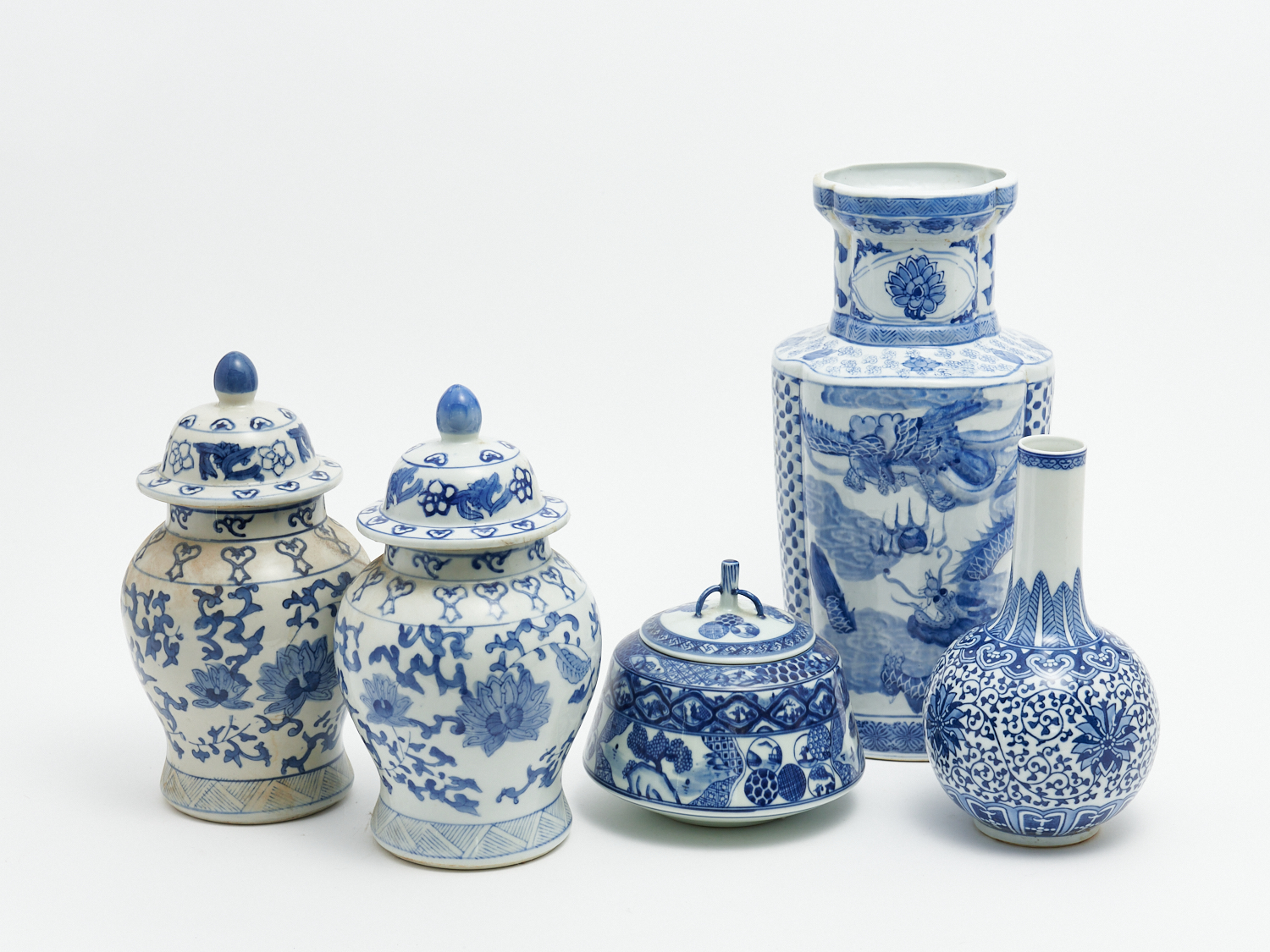 A GROUP OF BLUE AND WHITE CHINESE PORCELAIN VASES AND URNS H.37CM (TALLEST), LEONARD JOEL LOCAL DELIVERY: MEDIUM