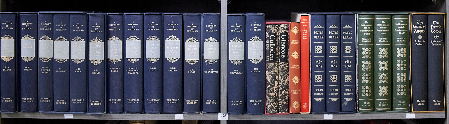 TWO SHELVES OF FOLIO SOCIETY EDITIONS OF WORKS ON ENGLISH AND EUROPEAN HISTORY, LEONARD JOEL LOCAL DELIVERY: MEDIUM