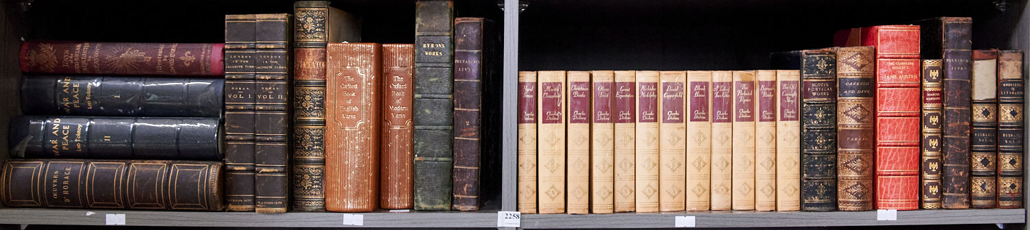 TWO SHELVES OF ANTIQUARIAN AND LATER FINELY-BOUND EDITIONS OF ASSORTED ENGLISH AND EUROPEAN LITERATURE, INCLUDING A SET OF DICKENS, LEONARD JOEL LOCAL DELIVERY: MEDIUM