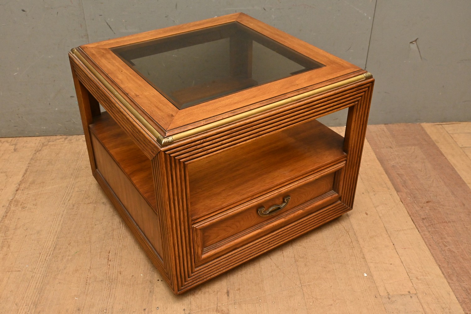 A SINGLE DRAWER SIDE TABLE WITH INSET GLASS TOP (A/F) (56H X 67W X 67D CM) (THIS HEAVY ITEM MUST BE REMOVED BY CLIENTS OR CARRIERS AT THE CUSTOMERS EXPENSE. LEONARD JOEL STAFF CANNOT ASSIST CARRYING THIS ITEM)