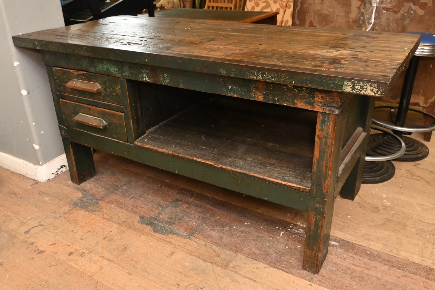 A SUBSTANTIAL RUSTIC TIMER WORK BENCH (87H X 183W X 81D CM) (THIS HEAVY ITEM MUST BE REMOVED BY CLIENTS OR CARRIERS AT THE CUSTOMERS EXPENSE. LEONARD JOEL STAFF CANNOT ASSIST CARRYING THIS ITEM)