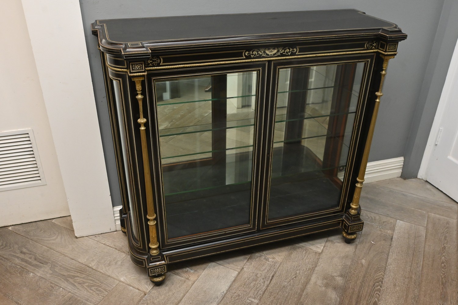 A LATE VICTORIAN EBONIZED AND INLAID DISPLAY CABINET (with key) ( 107H X 123W X 47D CM) (PLEASE NOTE THIS HEAVY ITEM MUST BE REMOVED BY CARRIERS AT THE CUSTOMER'S EXPENSE. LEONARD JOEL STAFF CANNOT ASSIST CARRYING THIS ITEM) (X-LARGE ITEM)