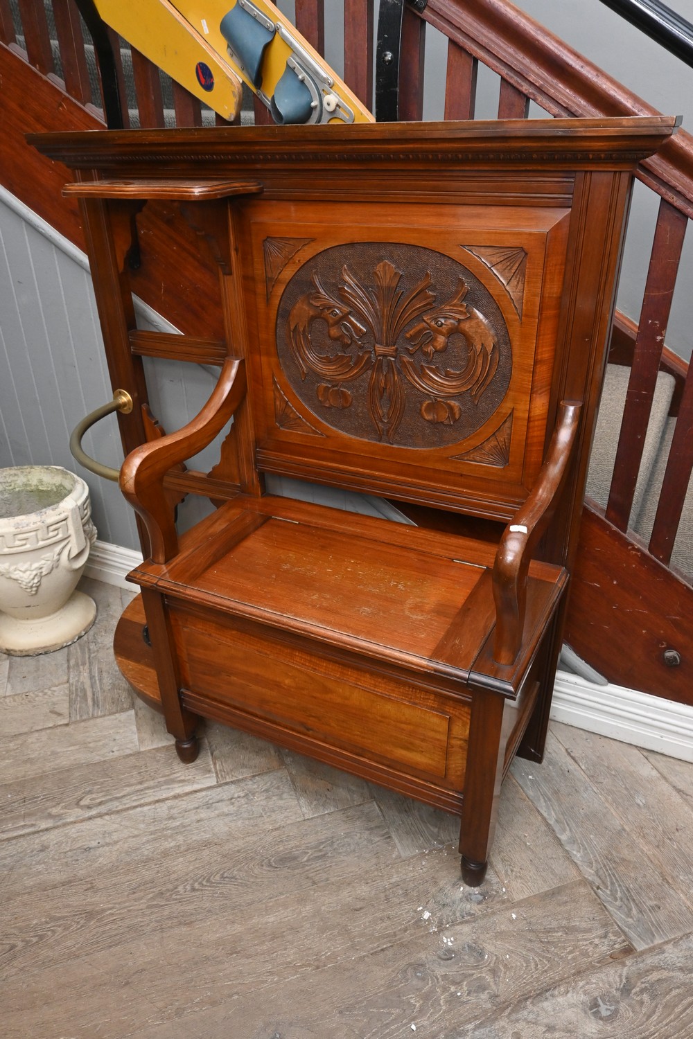 A LATE VICTORIAN BLACKWOOD HALL SEAT (A/F) (124H X 118W X 45D CM) (THIS HEAVY ITEM MUST BE REMOVED BY CLIENTS OR CARRIERS AT THE CUSTOMERS EXPENSE. LEONARD JOEL STAFF CANNOT ASSIST CARRYING THIS ITEM)