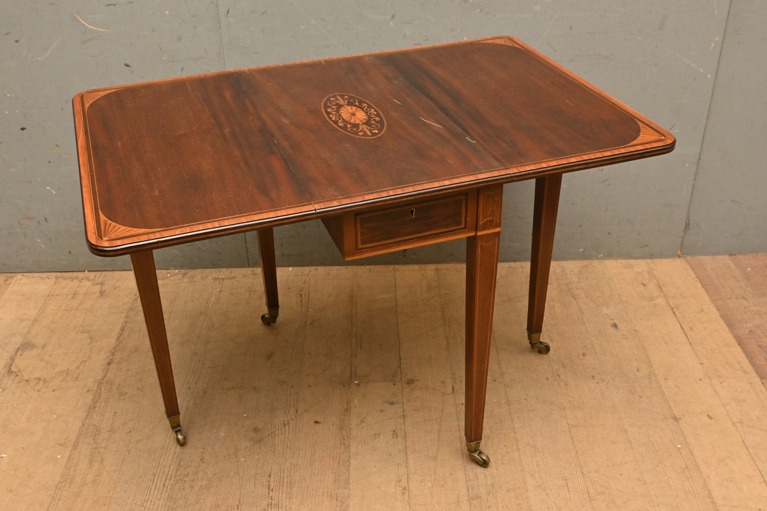 A MAHOGANY AND INLAID LOW PEMBROKE TABLE IN GEORGE III MANNER ( A/F) ( 62H X 91W X 61D CM) (LEONARD JOEL DELIVERY SIZE: LARGE)