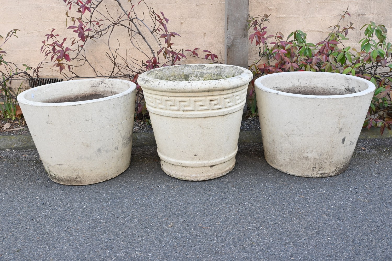 A GROUP OF THREE VINTAGE AUSTRALIAN MADE CONCRETE GARDEN POTS (A/F) (46H X 51D CM) (THIS HEAVY ITEM MUST BE REMOVED BY CLIENTS OR CARRIERS AT THE CUSTOMERS EXPENSE. LEONARD JOEL STAFF CANNOT ASSIST CARRYING THIS ITEM)