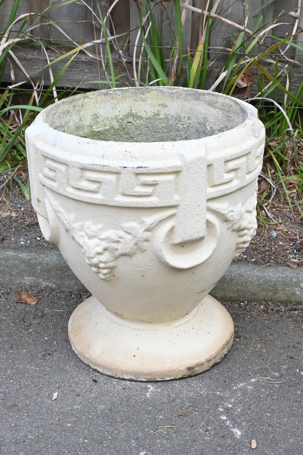 A CONCRETE GARDEN POT WITH GREEK KEY PATTERN AND RAISED VINE AND GRAPE DESIGN (A/F) (24H X 64W X 33D CM) (THIS HEAVY ITEM MUST BE REMOVED BY CLIENTS OR CARRIERS AT THE CUSTOMERS EXPENSE. LEONARD JOEL STAFF CANNOT ASSIST CARRYING THIS ITEM)